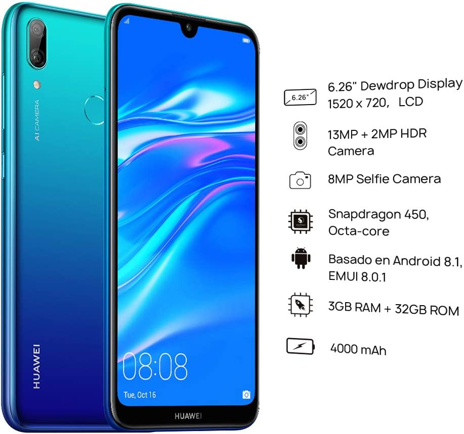 • 6.26-inch HD+ HUAWEI Dewdrop display (19:9, 1520 x 720)