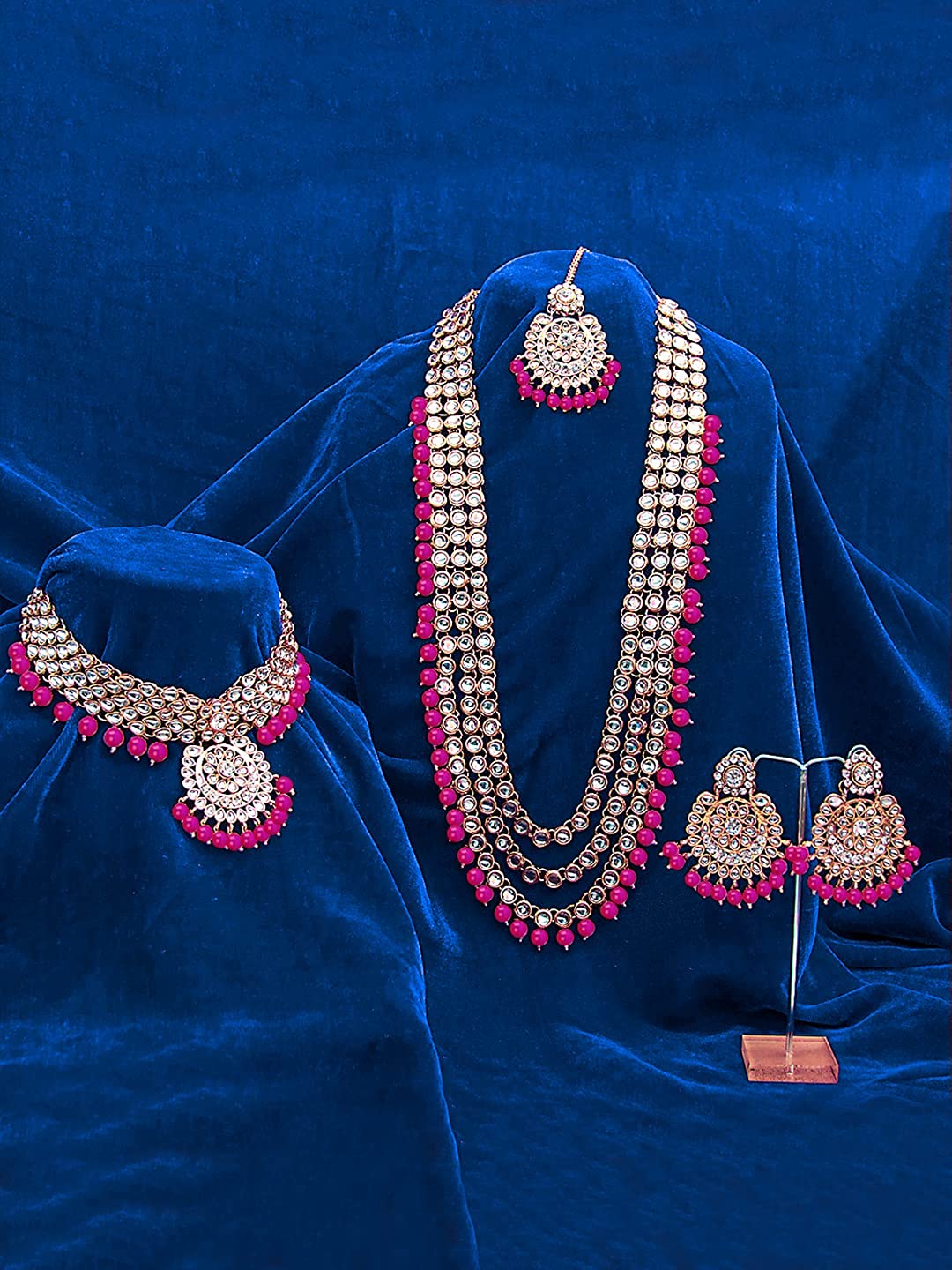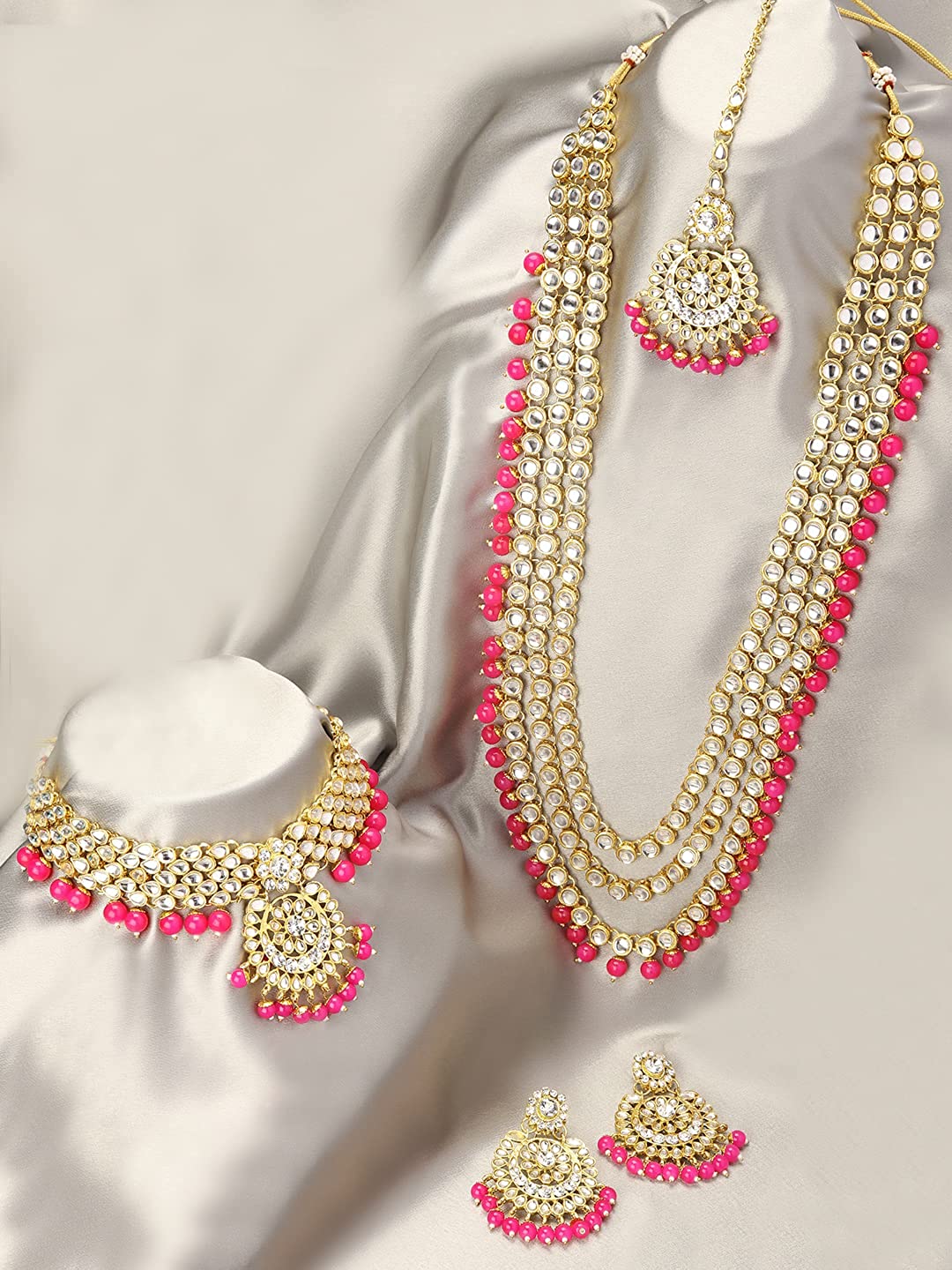 Aheli Indian Wedding Kundan Beaded Bridal Long Choker Necklace Earrings with Maang Tikka Traditional Jewellery Set for Women