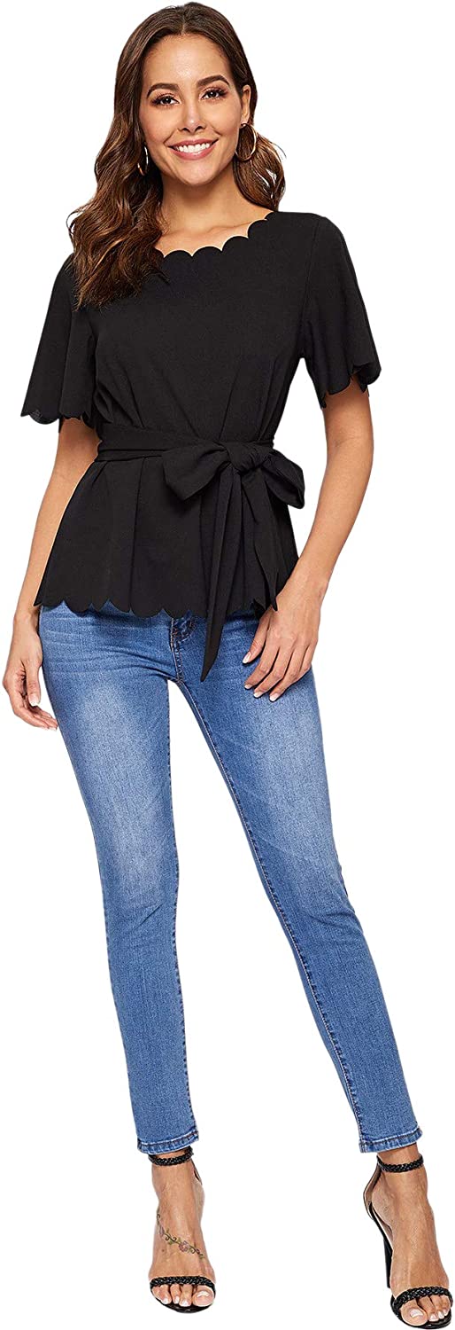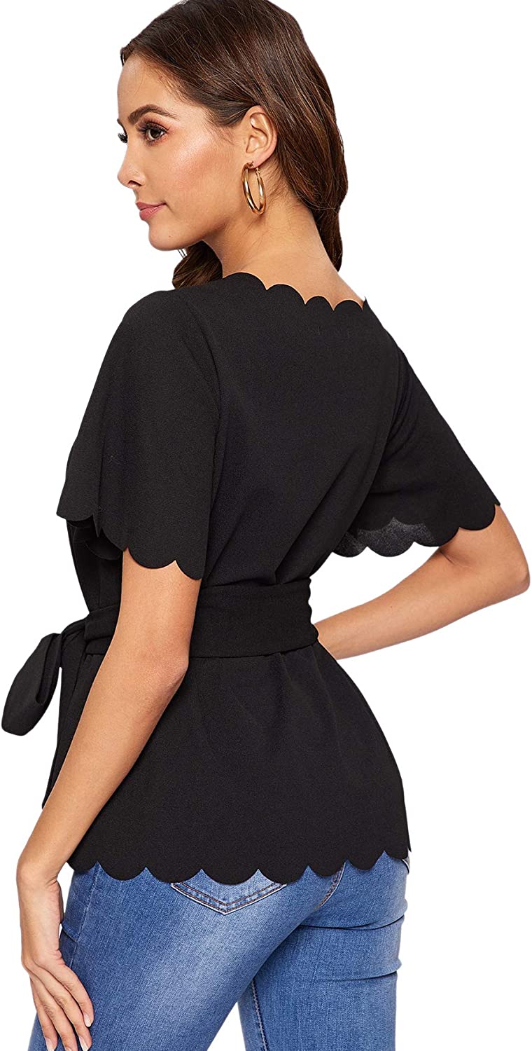 Romwe Women's Bow Self Tie Scalloped Cut Out Short Sleeve Elegant Office Work Tunic Blouse Top