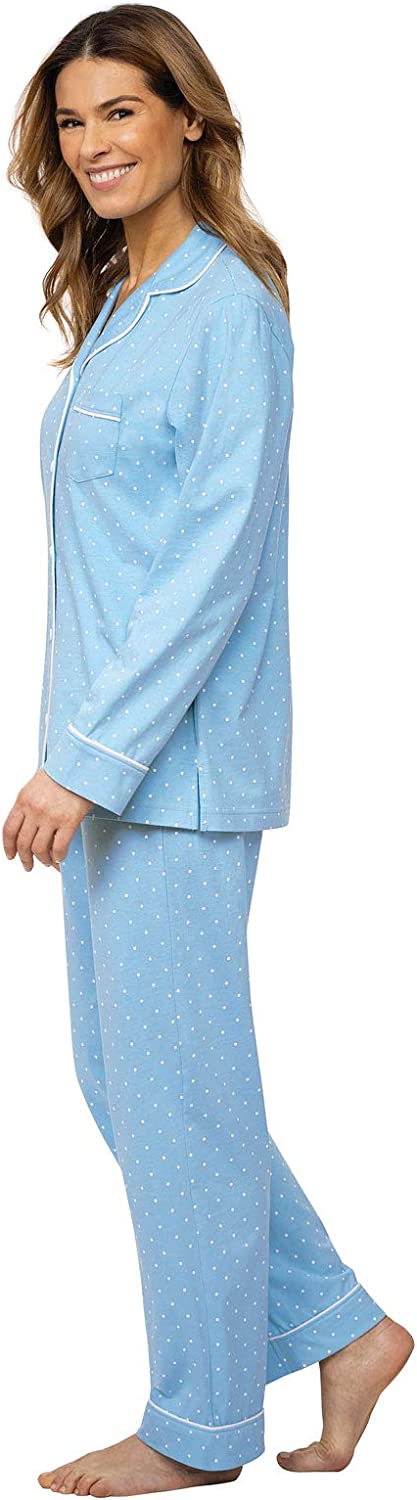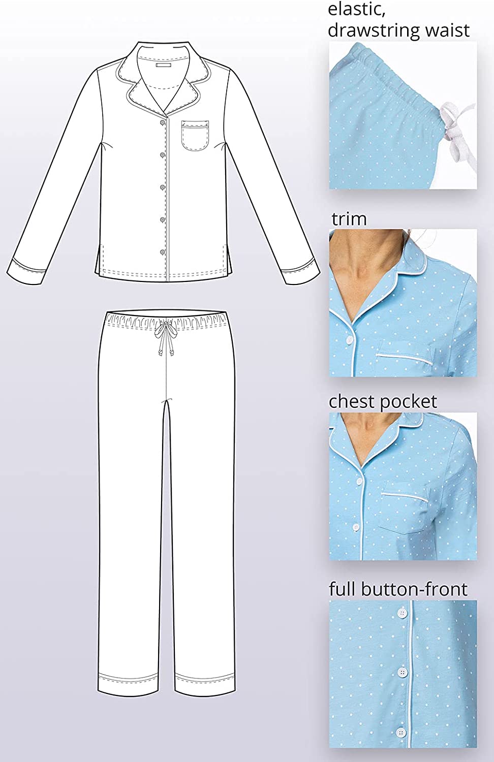 • Two-Piece Matching Set - Long-sleeve, button-front top and full-length, relaxed fit pants; savor falling asleep in this timeless, classically styled two-piece matching pajama set for Women featuring a notched collar, a breast pocket, elegant piping on the trim, and an elastic drawstring waist; available in our exclusive rich solids and playful polka dots.