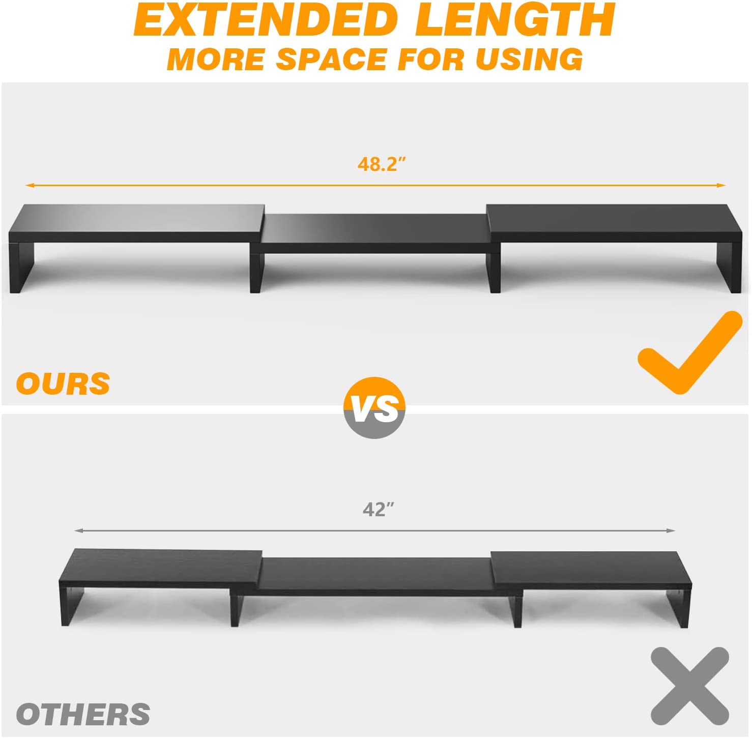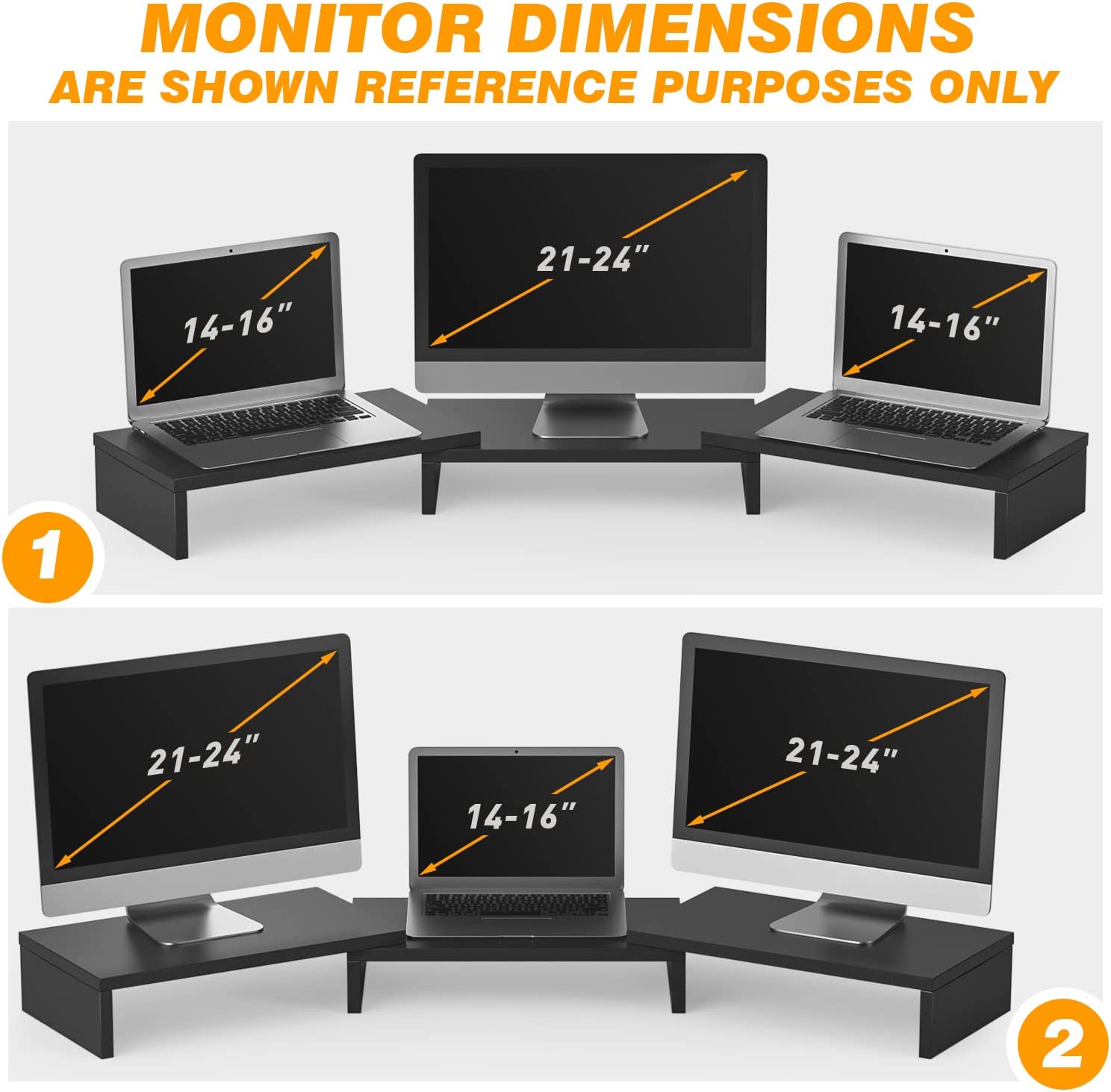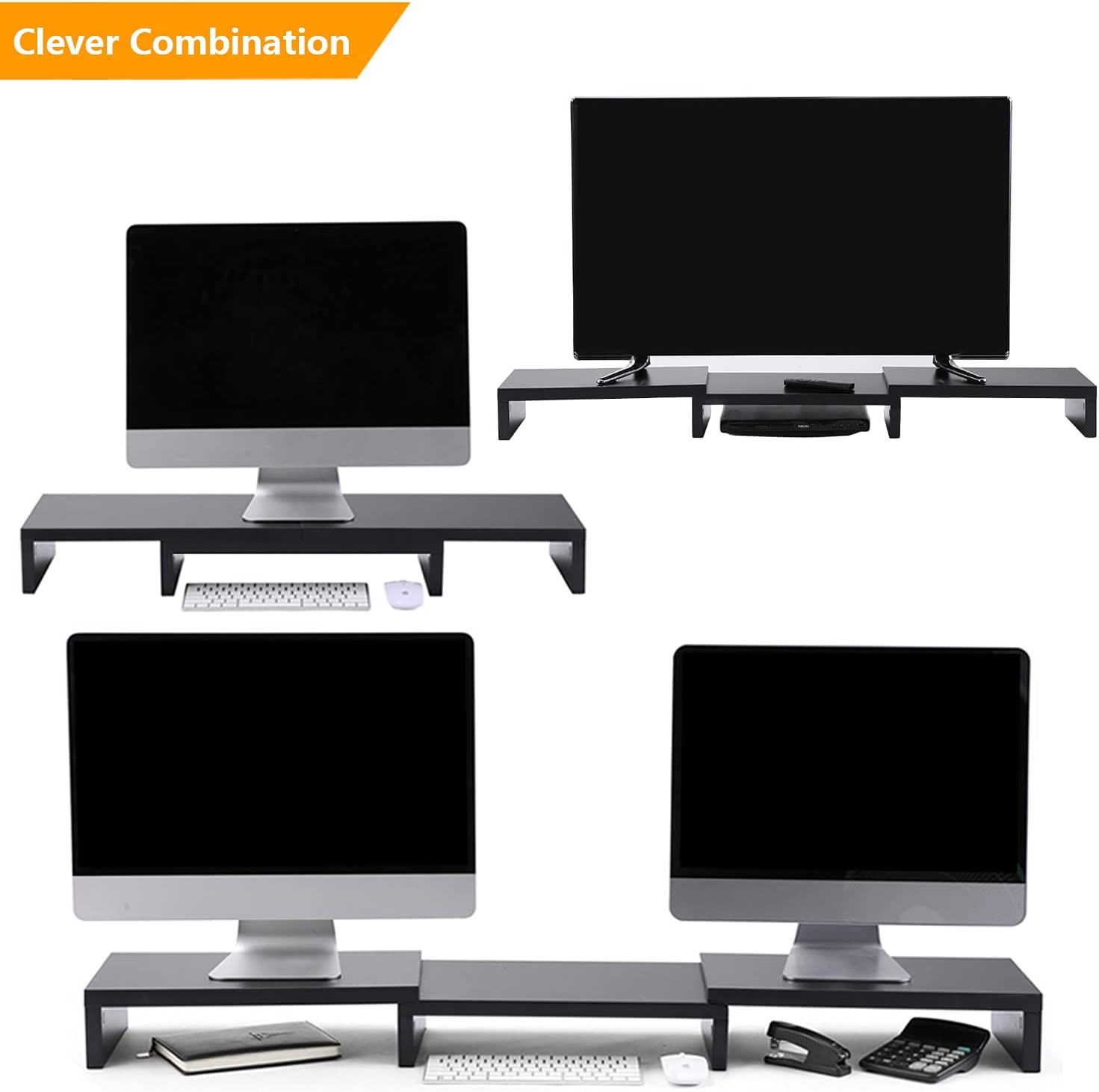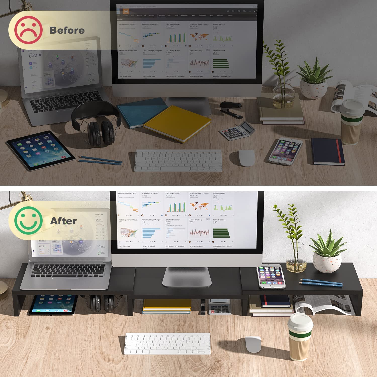 • 【Customizable 3 Shelf Design】Featuring adjustable length (33-48.2 inch) and angle, this desk computer stand riser can be place on a corner desk or in a straight-line, table like setup, which supports 2-3 monitors while offering enough space underneath for smaller desk essentials, or to tuck your keyboard and mouse away.