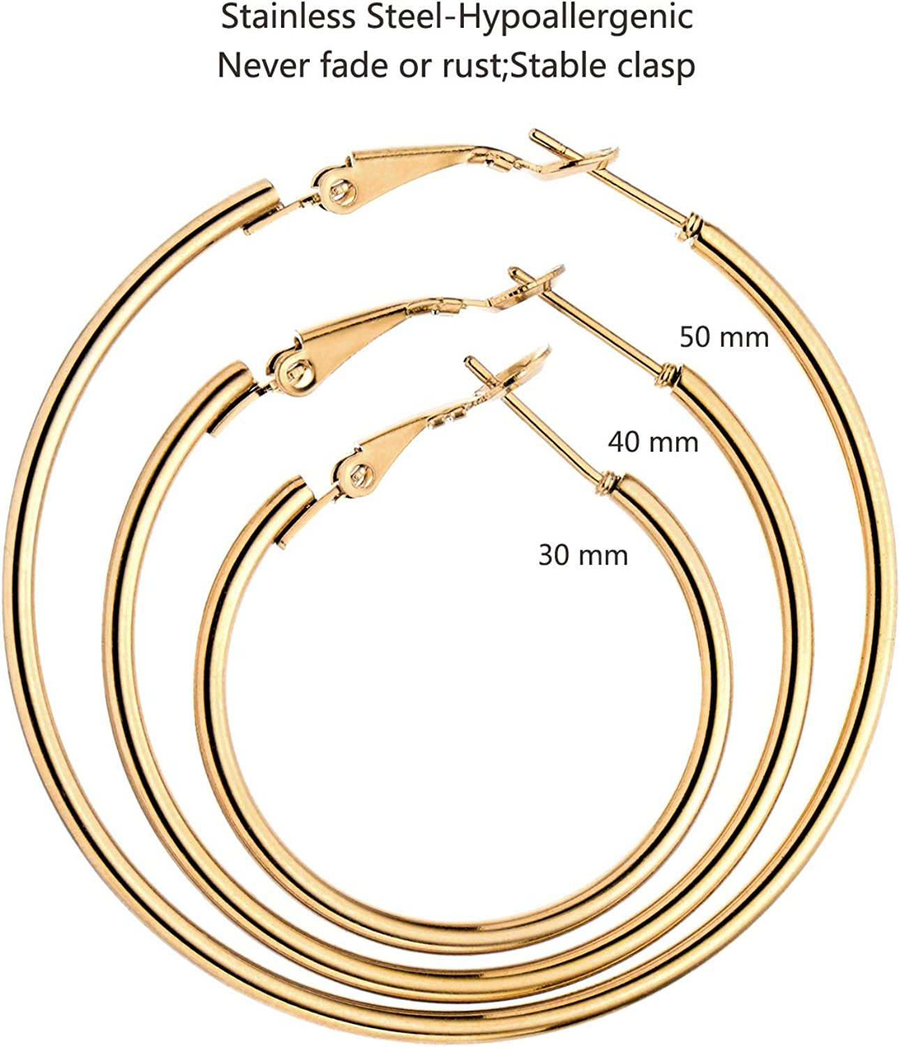 6 Pairs Stainless Steel gold silver Plated Hoop Earrings for Women Girls, Hypoallergenic Hoops Women's Earrings Loop Earrings Set (30.40.50mm)