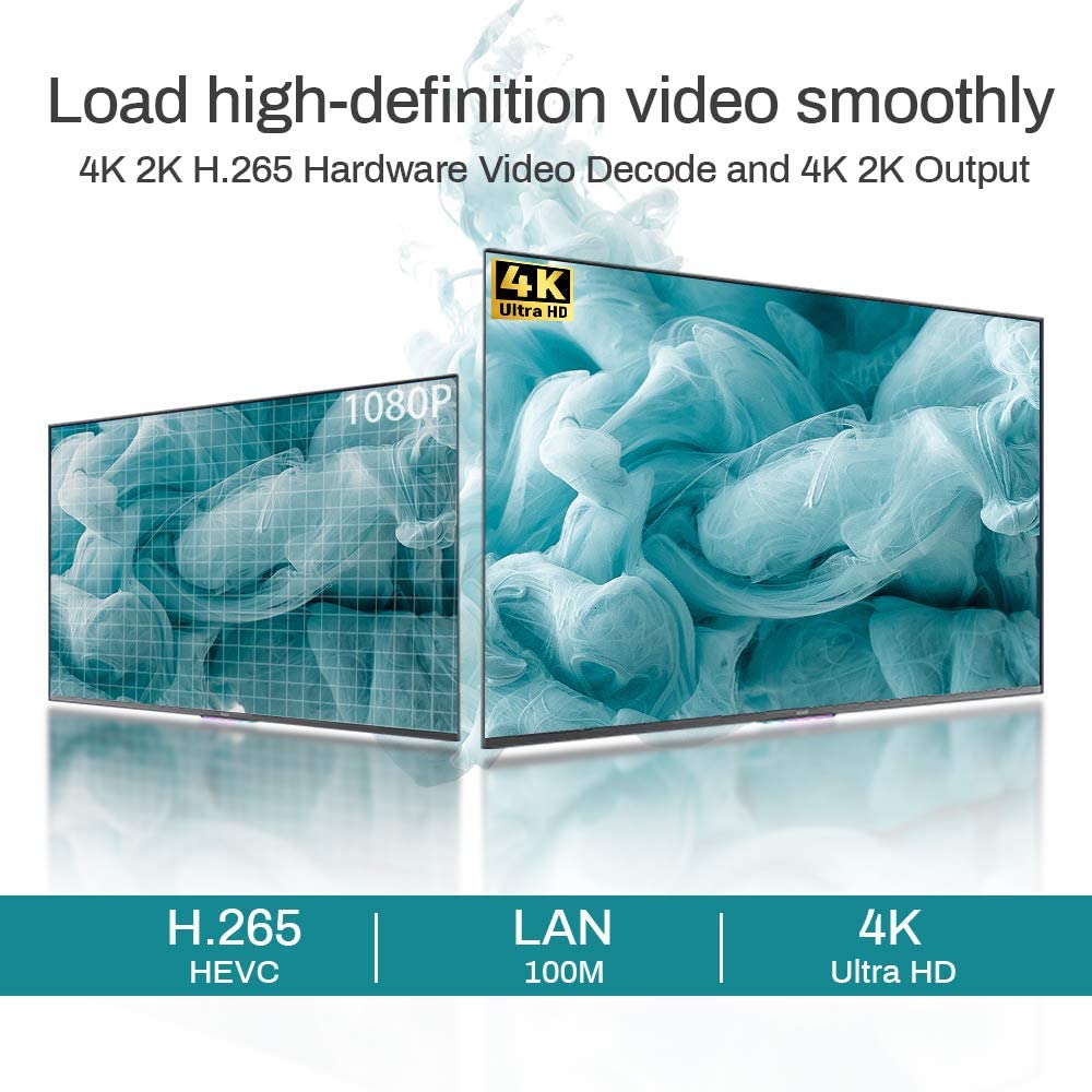 • 【3D+4K & H.265】TV box supports 4K resolution and 3D function. You can watch Ultra HD movies freely at home at any time without going to the cinema. H.265 image processing technology make you watch movies more smoothly with the same picture quality loaded. The 4K 1080i/p resolution is 4 times more than full HD, so you can see every detail of the screen is glossy.