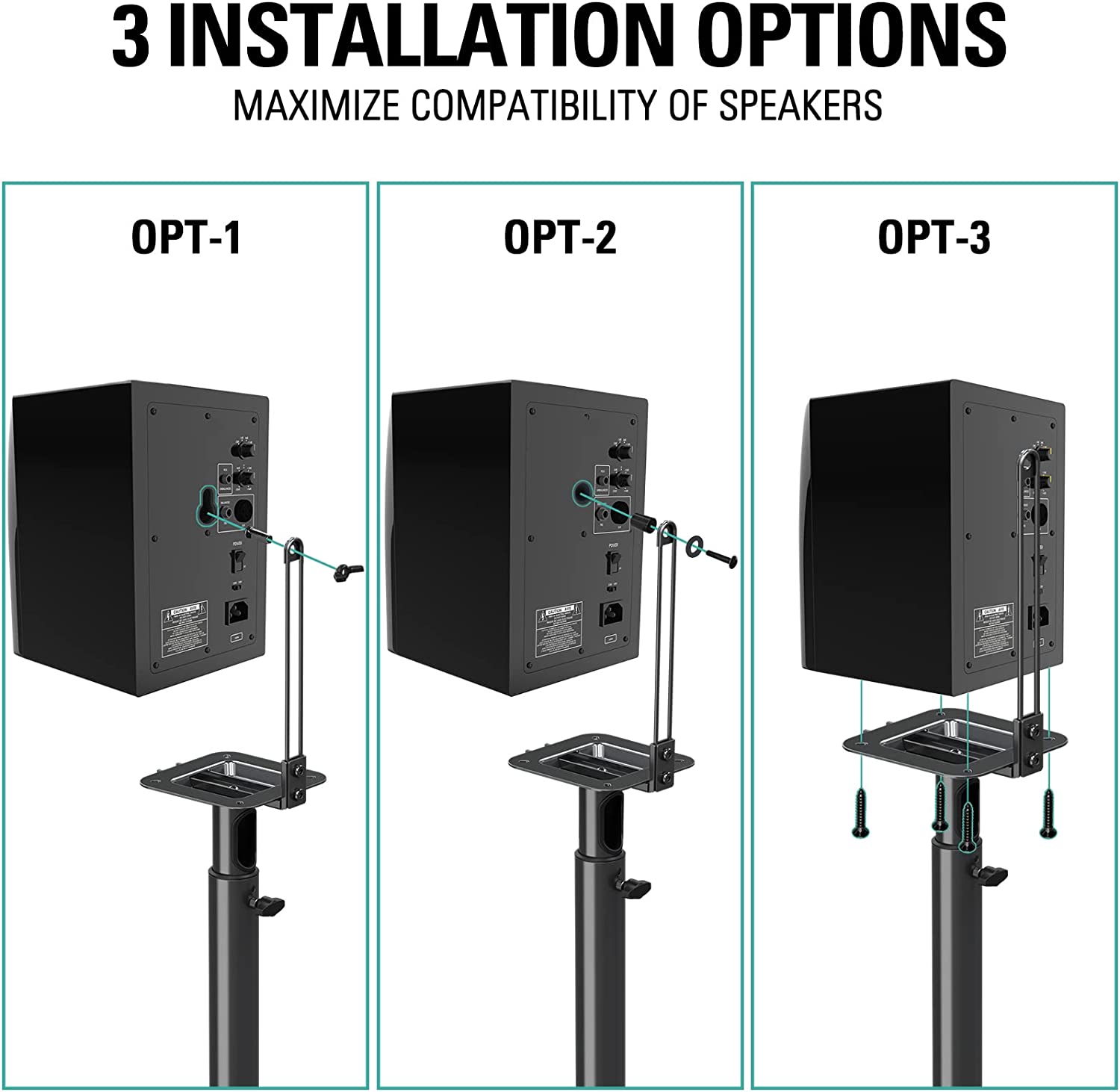EASY ASSEMBLY - Our speaker stands can be assembled in minutes. With adjustable speaker bracket, these floor speaker stands can work on speakers of MAX size 9.4"(D) x 18"(H) with mounting holes up to 13 inches height