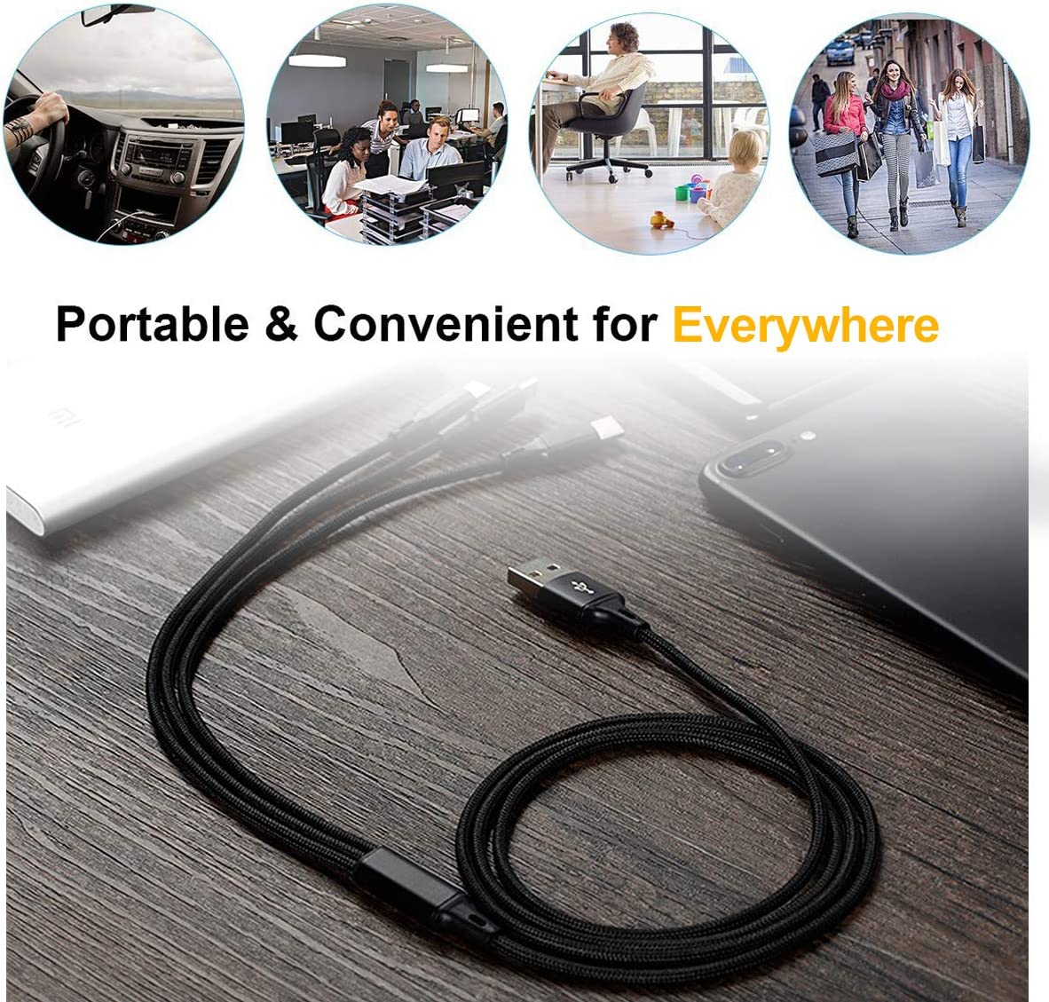 • ✔Incredibly Durable: Comfortable Nylon Braided cord is tangle-free and unbreakable. Over 5000+ bend lifespan makes multi phone charger cable more durable than other cable. In addition, using high-quality heat resistant aluminum alloys terminals to increase reliability and durability. Connector tersted 10000+ times, never in worse connection.