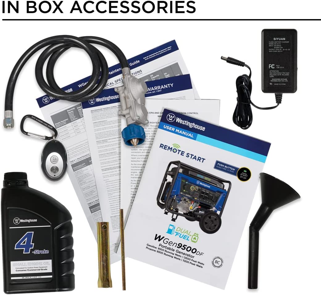 The Westinghouse WGen9500DF Dual Fuel Portable Generator produces up to 12, 500 peak watts and 9, 500 running watts, the WGen9500DF is a dual fuel generator that operates on gasoline or propane (LPG). The heavy duty 457cc 4-Stroke OHV Westinghouse Engine is constructed of a durable cast iron sleeve and runs for up to 12 hours on a 6. 6 gallon (25 L) gas tank, keeping you powered through the day with built-in fuel gauge, automatic low oil shutdown, and GFCI outlets. Push-Button Electric Start makes starting the WGen9500DF effortless while the remote start key fob offers added ease from a distance. Its intuitive control panel spotlights the Transfer Switch Ready L14-30R and larger 14-50R to power your major appliances like the air conditioner, refrigerator, and sump pump as well as any lights or entertainment centers all at the same time with a single cord hookup. VFT Data Center displays volt output, frequency, and lifetime hours to keep you up to date with real-time information and regular maintenance. Conveniently portable with an included set of heavy duty never-flat wheels, handle, and lift bracket, it'll have your house, travel trailer, or jobsite powered in seconds. The WGen9500DF is complete with 3-Year limited service, labor, and parts coverage with Lifetime Technical Support backed by our nationwide customer service and support network.