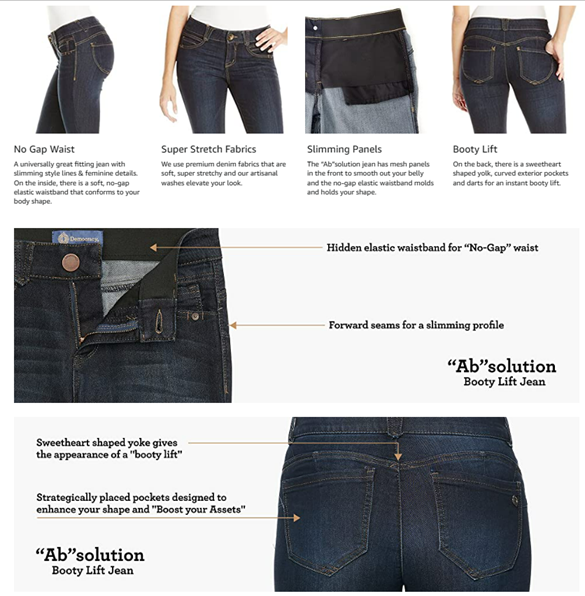 - Democracy’s signature “Ab”solution jean uses innovative construction that incorporates super-stretch denim, slimming panels, a hidden inner elastic waistband, mesh panels, signature curved back yoke, and strategically placed pockets