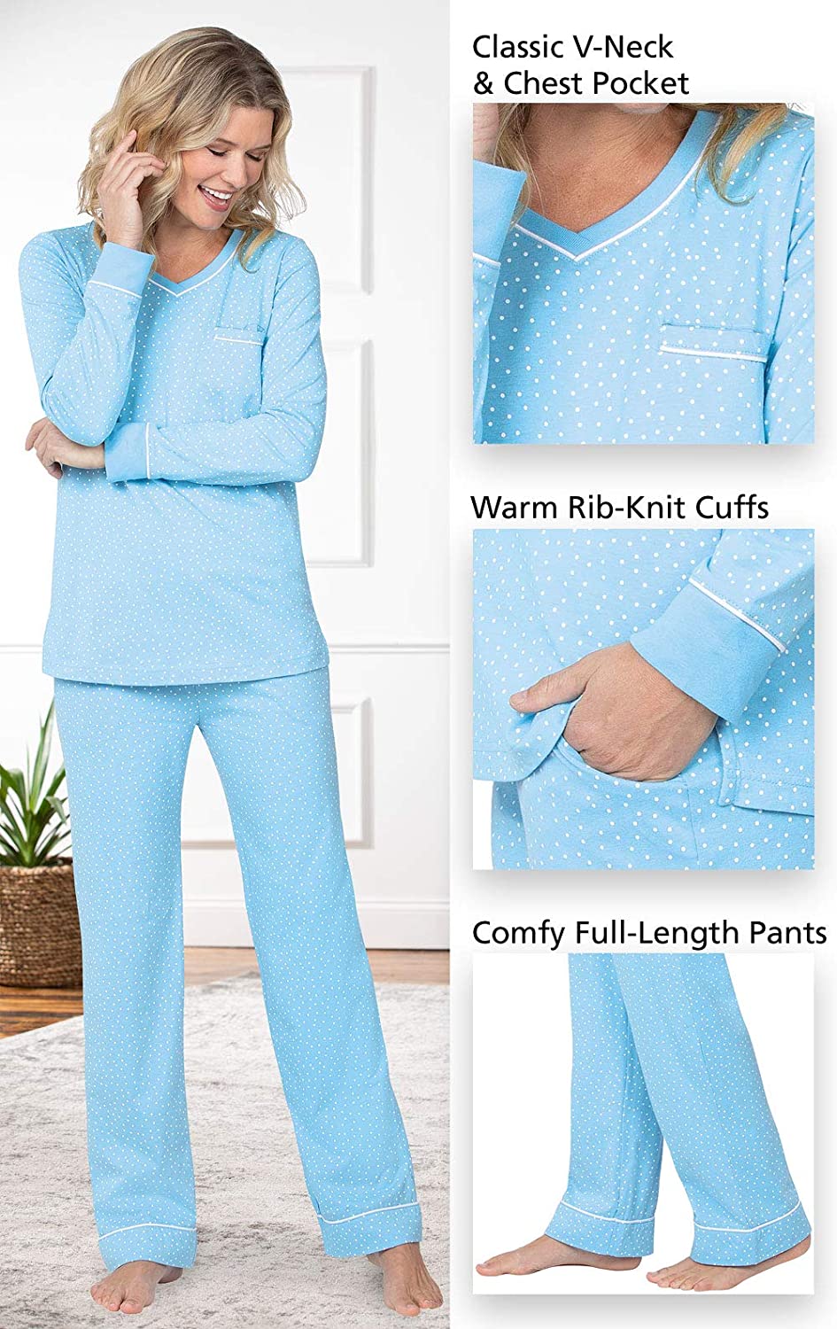 • Two-Piece Pullover PJ Set - Women's cotton pajama set features a long-sleeve v-neck shirt with rounded hem and chest pocket; matching long pajama pants with an elastic drawstring waist; pj set for women is available in our classic polka dots or rich solids, with contrast trim.
