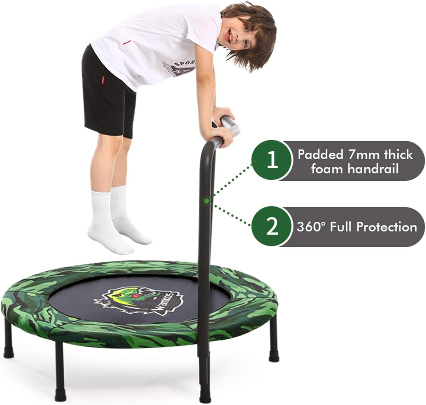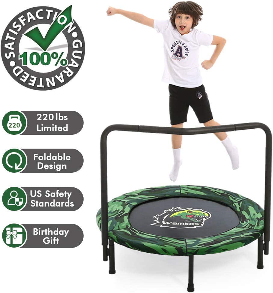 36-Inch Dinosaur Mini Trampoline for Kids with Handle, Foldable Kids Trampoline for Play & Exercise Indoor or Outdoor, Camo Safty Padded Cover Toddler Rebounder Trampoline for Jump Sports