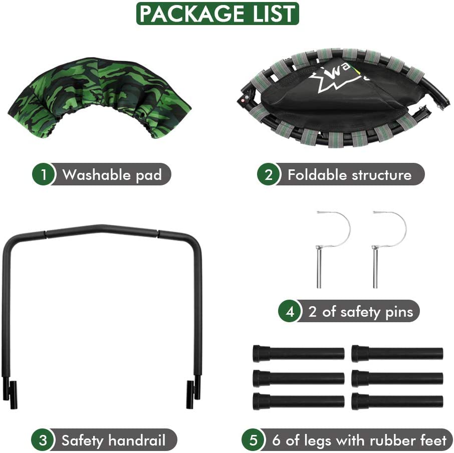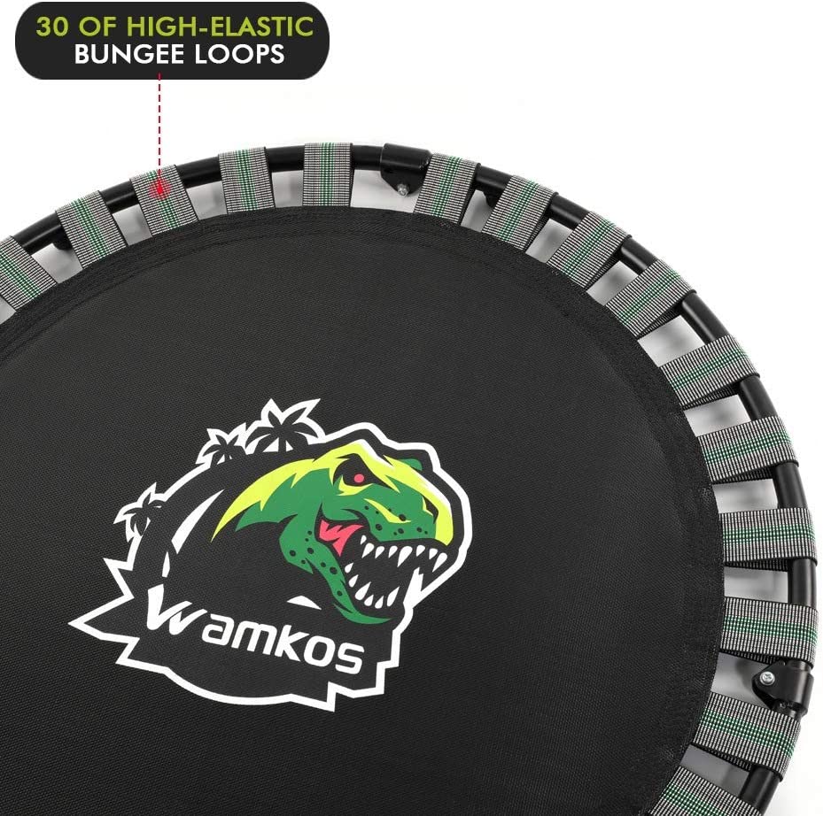 • ✅QUALITY DESIGN & SAFE: This indoor trampoline has a great bounce, made of a sturdy steel frame, a durable jumping mat and 30 of tension quiet bands, ultra-quiet, forgiving shock absorption, smooth rebound, no squeaks bounce. Rubber-tipped legs prevent scuffing of non-carpeted floors. In addition, the foam-covered handle and the protective cover provide all-round protections for your children' safe and secure jumping.