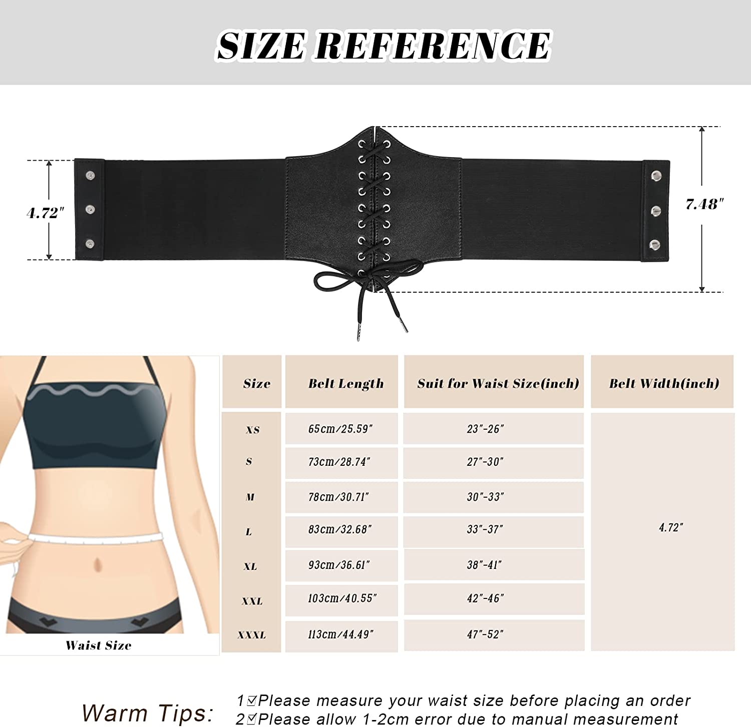 • ☘ CLASSIC DESIGN– Classic vintage style leather lace-up tied waspie corset belt,high quality PU leather front sewed with well elastic wide band, fastened by 3 snap buttons, which is easy to put on and remove. This waspie corset belt is super comfortable to wear. Flatters your waist. The 7.6" width prevents dress belt from rolling up or rolling down in wearing.