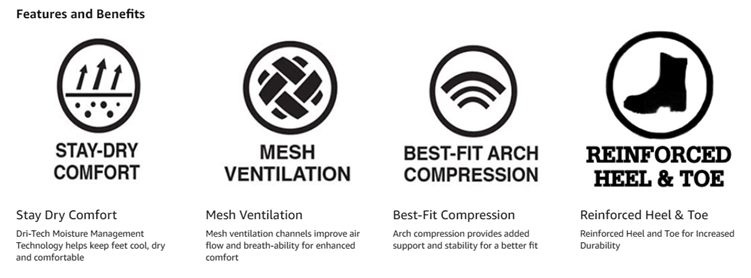 Dickies dri-tech comfort Pairs crew with wicking, moisture management fibers keeps feet dry, ventilation channels engineered for air circulation and moisture control, arch compression hugs feet and keeps socks in place, while providing in-step support, Reciprocated heel and toe for superior fit and full cushion comfort.