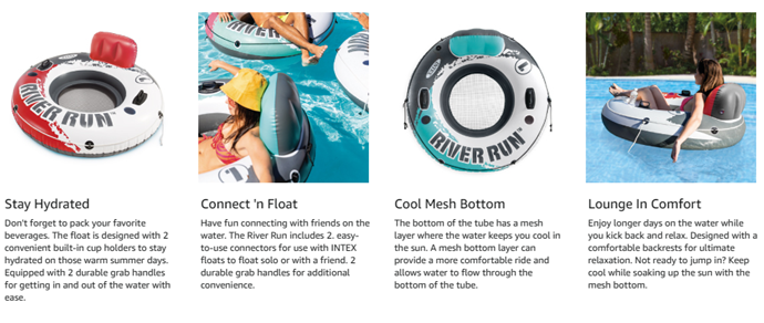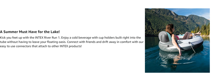 The Intex® River Run inflatable tube is designed to fit an adult and it's perfect for tubing down the river, in the lake, or in the pool. The River Run™ tube is designed for high-performance fun. The bottom of the tube has a mesh layer where the water keeps you cool in the sun. The cup holders and backrest are added comforts on the water. The 18-gauge (0.46mm) vinyl material is durable and cool to the touch.