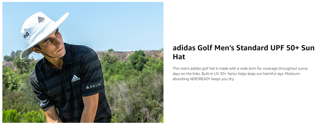 - This men's adidas golf hat is made with a wide brim for coverage throughout sunny days on the links. Built-in UV 50+ factor helps keep out harmful rays. Moisture-absorbing AEROREADY keeps you dry.