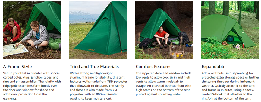 • "classic a-frame style tent sleeps four (8' 9" by 7' 2" floor; 63 square foot area); center peak height of 58 inches; weighs 7 pounds, 13 ounces."