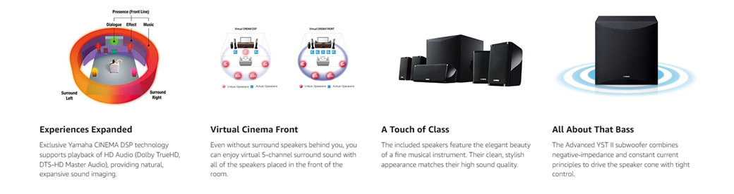 • Easy setup with Yamaha YPAO room optimization and flexible speaker placement options, including virtual cinema front