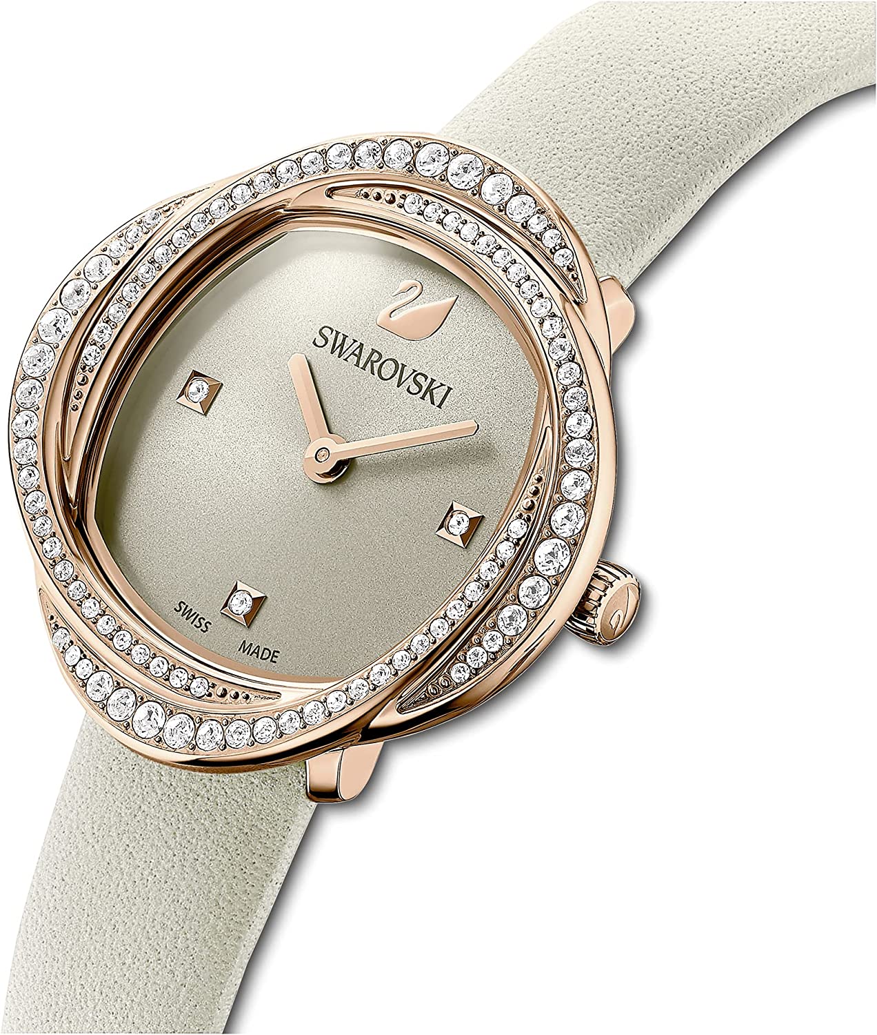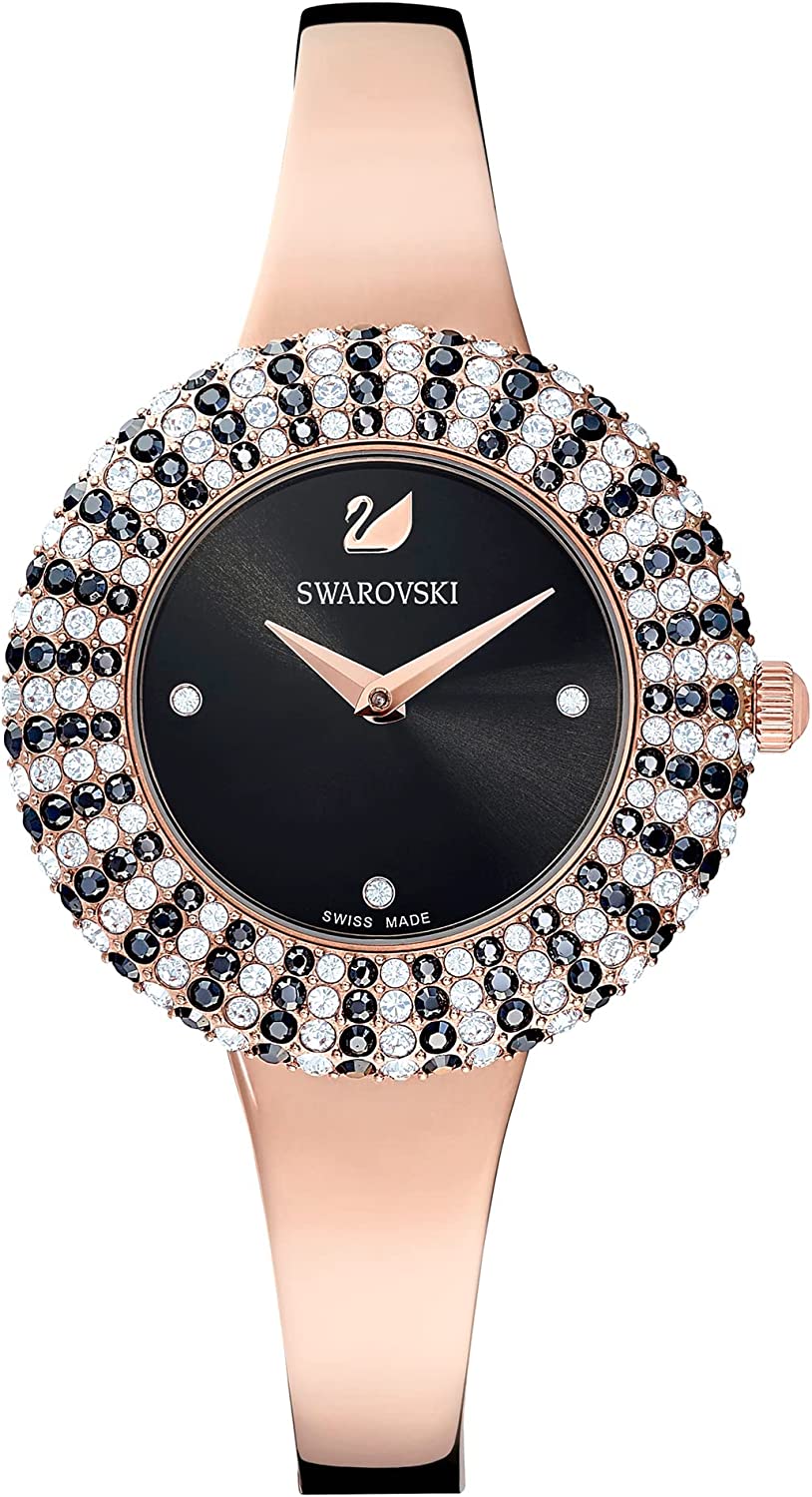 Items delivered: 1 x Swarovski Crystal Rose watch for women, 6 1/2 inch rose-gold tone stainless steel band, 1 1/4 inch crystal accented stainless steel case and black dial, with Swarovski watch box