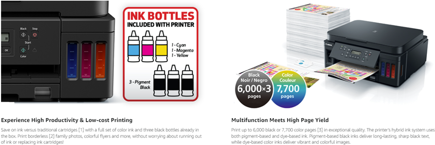 • With an impressive high page yield, print up to 6,000 Black text pages or 7,700 Color pages per each full ink bottle set.(2)The PIXMA G6020 MegaTank All-In-One Printer uses both pigment-based and dye-based ink. The pigment-based black ink formulation allows for long lasting and sharp black text. The dye-based ink formulation allows for vibrant and colorful images.