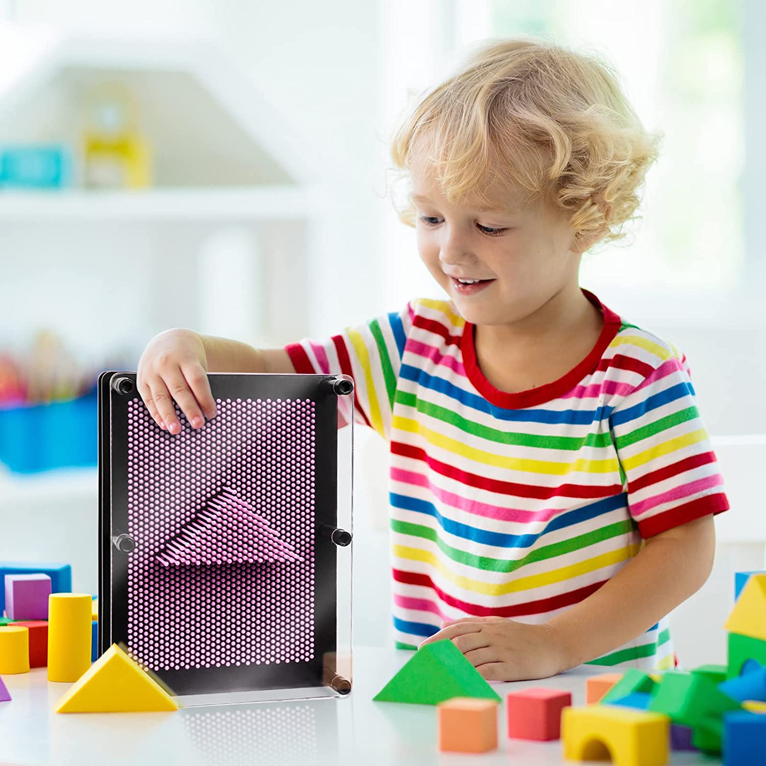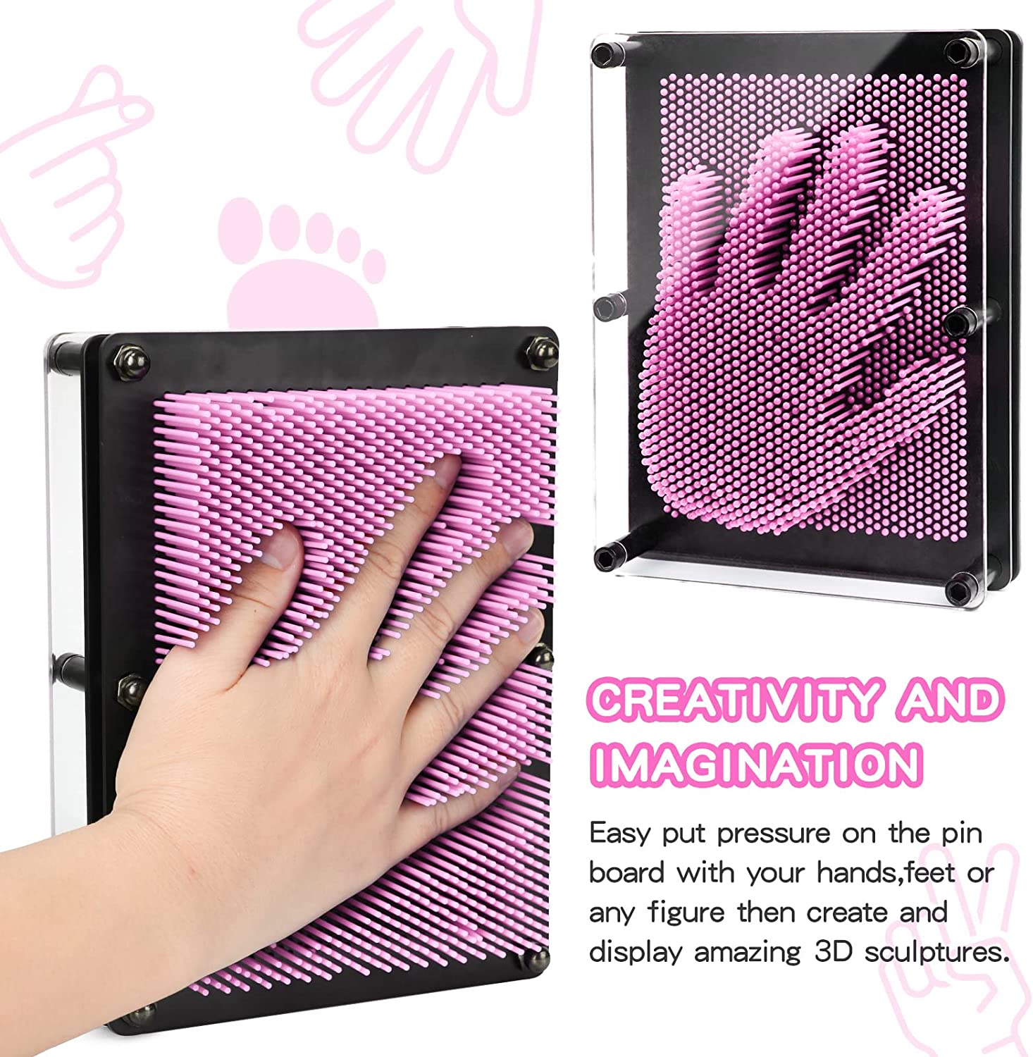 • 【PIN TOY FEATURES】Unique plastic pin board toy is different from metal pin impression toy. Our needle toy is lighter than other imprint toy and more convenient to carry and play with. Both edges of the pin are smooth and harmless for playing. Anytime you want to make a new print on the pin art for kids you place it horizontally and the hand impression toy is back the way it was. This upgraded 3d pin art board for kids has more different colors for exercising color recognition.