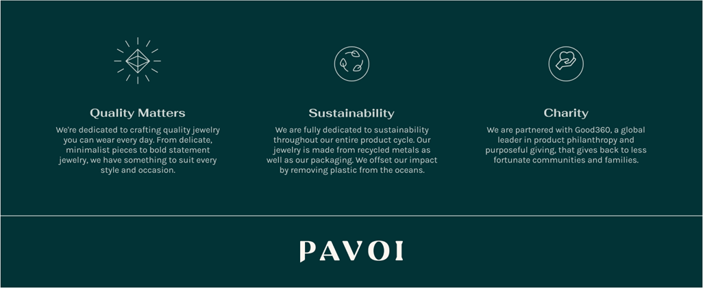 ✦ SUSTAINABILITY ✦ PAVOI is dedicated to sustainability throughout our entire product cycle. Our jewelry is made from 100% recycled materials and we package in 99% recycled and compostable materials. We work to reduce our carbon emissions and offset plastic consumption by removing 275,000 bottles from oceans annually. We are committed to maintain a balanced and eco-friendly business that minimizes our environmental impact. Trust that PAVOI is continuously working towards a greener future.