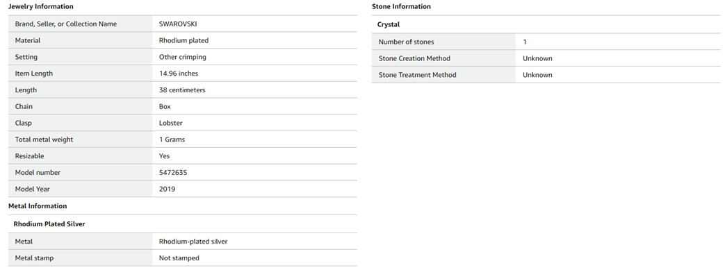 • Items delivered: 1 x Swarovski Solitaire Pendant for women, 15 inch rhodium plated metal chain, with 3/8 x 5/8 inches white center stone, complete with Swarovski necklace box
