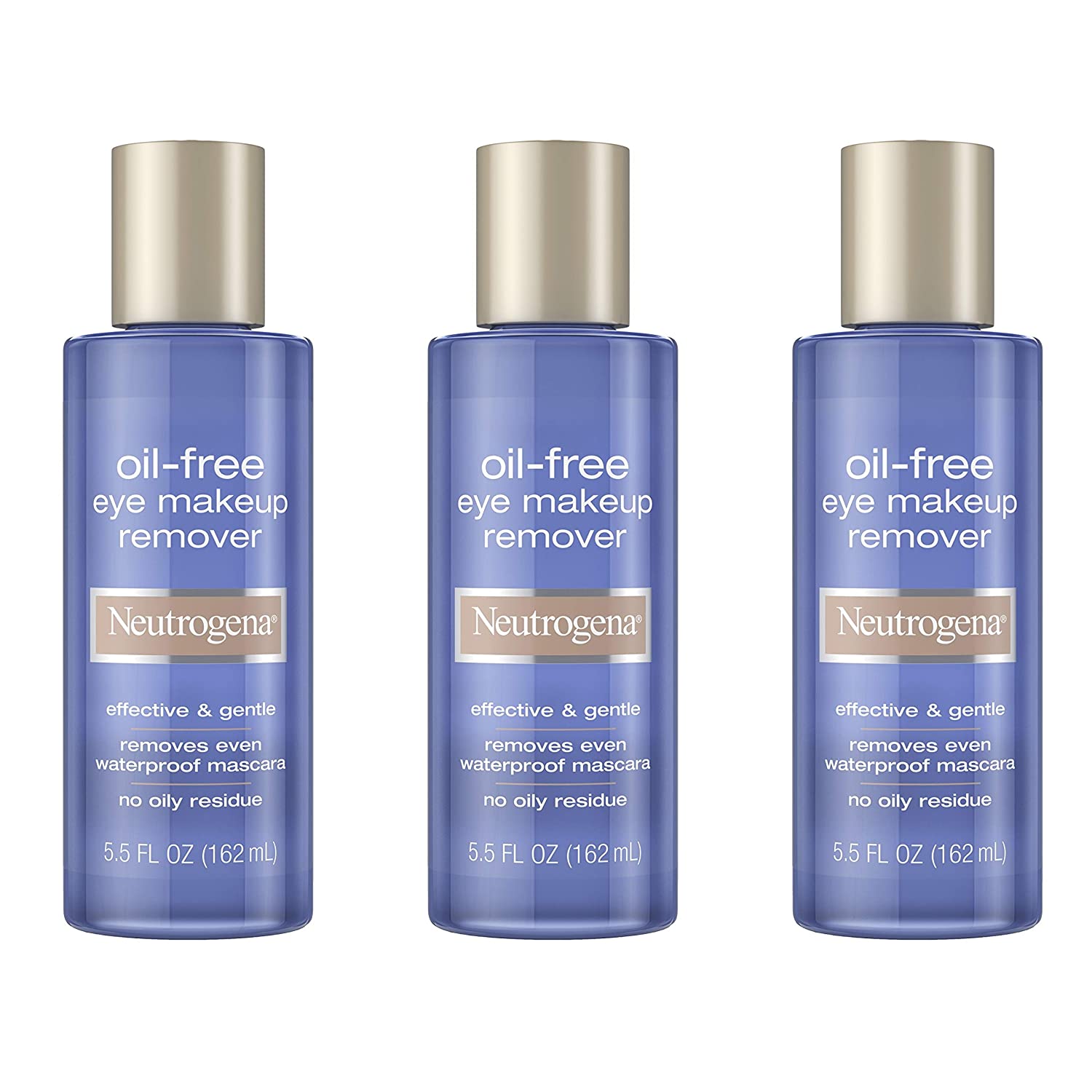 • Three 5 5-fluid ounce bottles of Neutrogena dual-phase 100% oil-free liquid eye makeup remover and makeup cleanser formulated with soothing aloe and cucumber for sensitive eyes