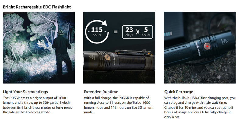 Included Components | Holster, PD36R Rechargeable flashlight, Charging Cable, LumenTac Organizer |