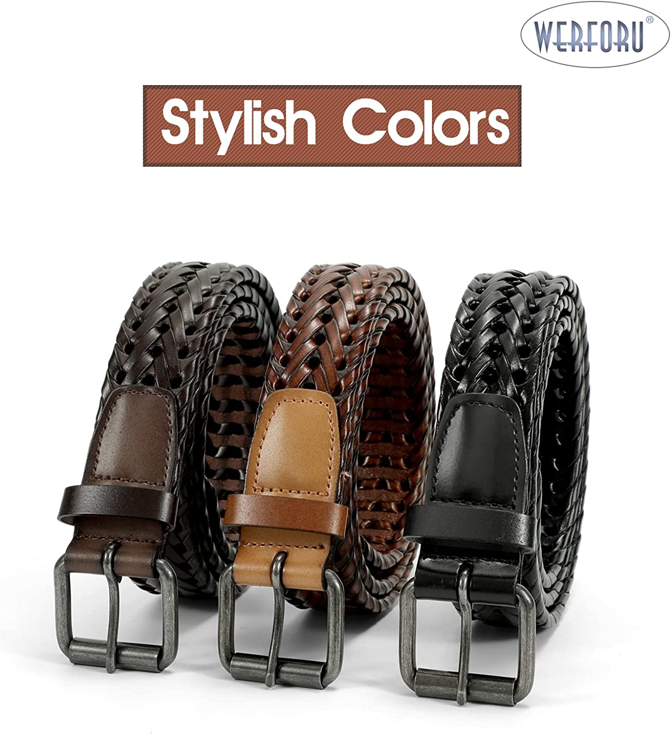 WERFORU Men’s Leather Braided Belt, Cowhide Leather Woven Belt for Jeans 1.3 Inch Wide with Prong Buckle