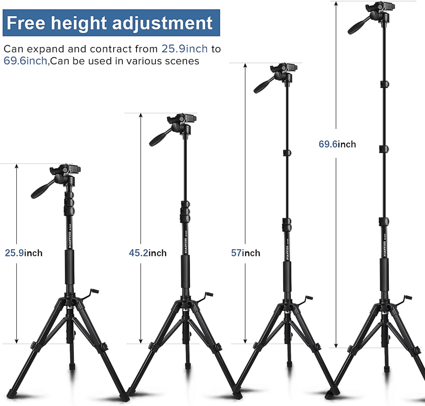 • 【Adjustable-height Matches Your Needs】 Camera stand can expand from 25.9 inches to 69.6 inches, which is suitable for children and adults. universal 1/4" screw can support most cameras like Canon Nikon. When used as phone tripod, it can take photos and videos, live broadcast, facetime, do the vlog, self-taking, tiktok.