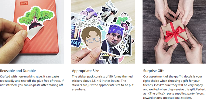 • ?There are 50 different Office Stickers in each pack. about 2.5 - 4.0inches stickers with vinyl material built for durability.