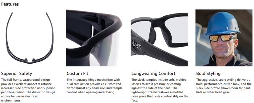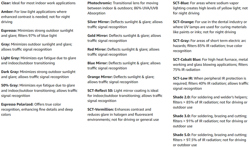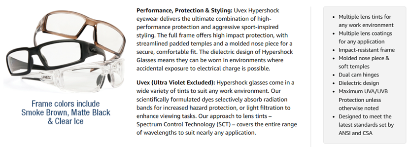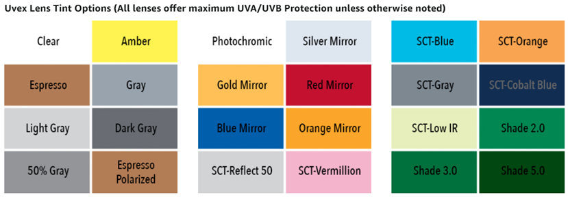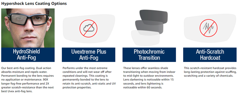Uvex Hypershock Safety Glasses are available with multiple lens tints to suit almost any work environment. Uvex stands for "Ultra Violet Excluded", which means our safety glasses employ specifically formulated resins that filter 99.9% of the UV radiation in accordance to the U6 scale of the Z87 standard. Uvex has also developed Spectrum Control Technology (SCT), which incorporates unique dyes designed to absorb select wavelengths of radiant energy (light). Our anti-glare glasses, tinted safety glasses and safety sunglasses are designed to manipulate light to reduce a spectral hazard, or to provide distinctive filtration for specific safety eyewear viewing tasks. Examples include filtering solar radiation to reduce glare, and blocking radiation from welding to protect workers around these operations. Multiple anti-fog and anti-scratch coatings are also available. The new HydroShield technology provides our best anti-fog lens coating, keeping your vision clear up to 90X longer than most other competitive anti-fog safety glasses. Models with the Uvextreme Plus anti-fog coating offer superior fog-free vision that lasts up to 10X longer than most other anti-fog coatings. Both anti-fog coatings provide 2X greater scratch resistance than most competitive anti-fog glasses. Our scratch-resistant safety glasses feature a durable hardcoat for long-lasting resistance to scuffing and scratching. Photochromic lenses offer seamless shade transitioning when moving from indoor work environments to mid-light and outdoor work areas. The full-frame design makes for strong impact-resistant glasses in accordance with ANSI Z87.1-2015 impact standards. The sport-inspired wraparound styling provides excellent side protection and peripheral vision. A molded nose piece and padded temples with molded inserts ensure your protective eyewear delivers longwearing comfort.