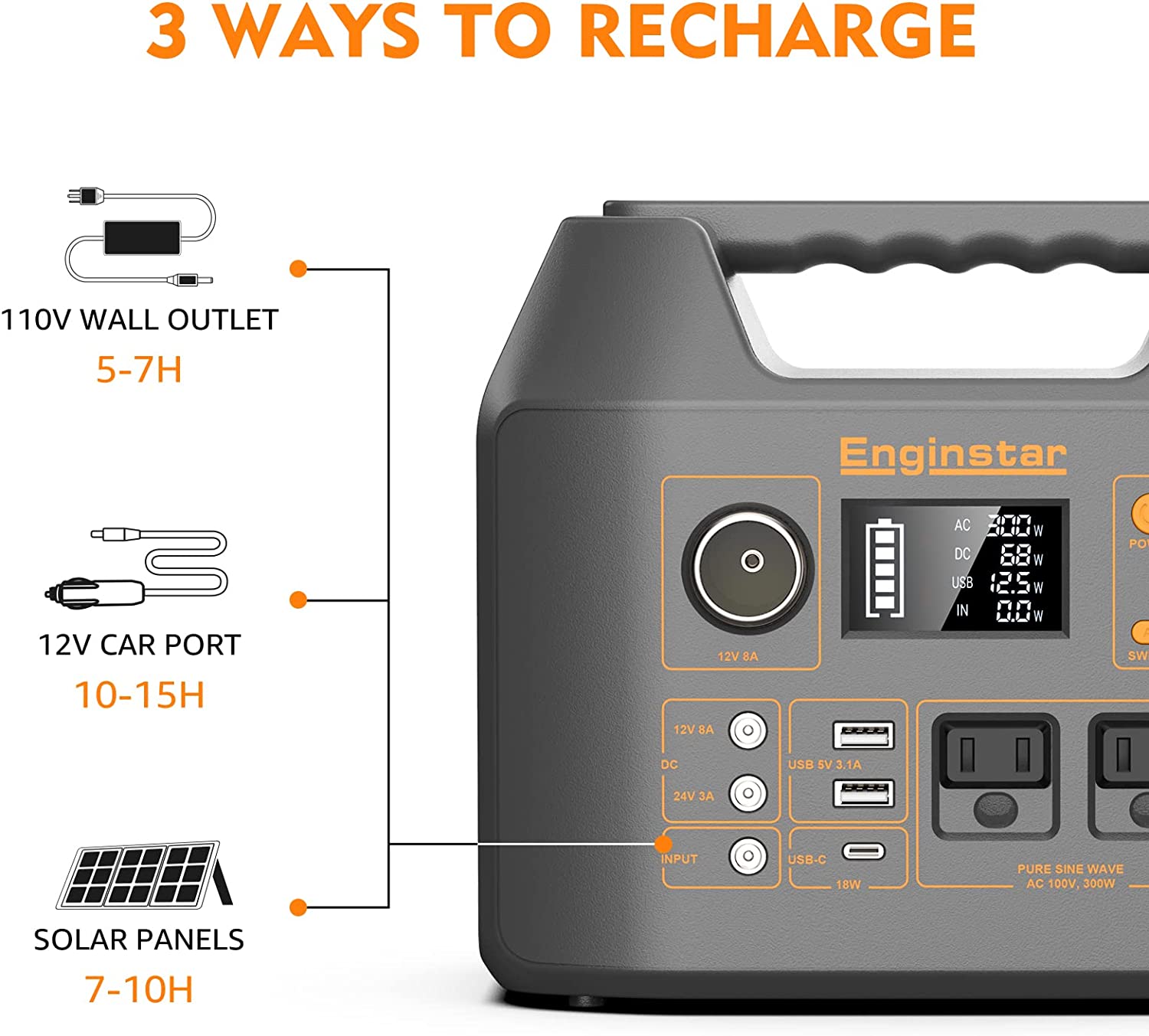 P.when("ReplacementPartsBulletLoader").execute(function(module){ module.initializeDPX(); }) PORTABLE BUT POWERFUL: With ETL Certification- With the portable size of 9 x 5.5 x 7.5 inches, weights only 6.5 pounds, but armed with 296wh capacity and 300W output, EnginStar portable power station can provide enough juice to charge your phones, laptop, camera, cpap, drone, etc. Designed with 8 output ports can charge several devices at the same time, which make it a perfect emergency power bank, outdoor and camping backup battery.