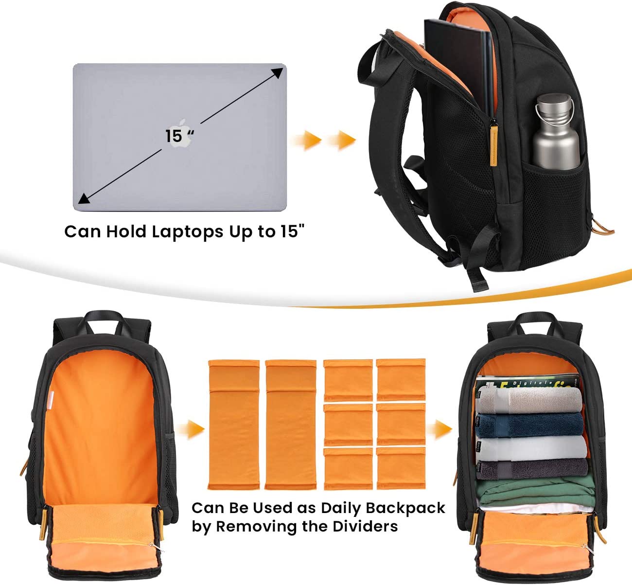 - 【Professional Camera Backpack with 15inch Laptop Compartment】 8 pieces padded removable dividers can be reorganized and offer certain protection for your own camera equipments. Camera tripod can be attached to the bottom of the camera bag. Dedicated 15inch laptop/tablet pocket.