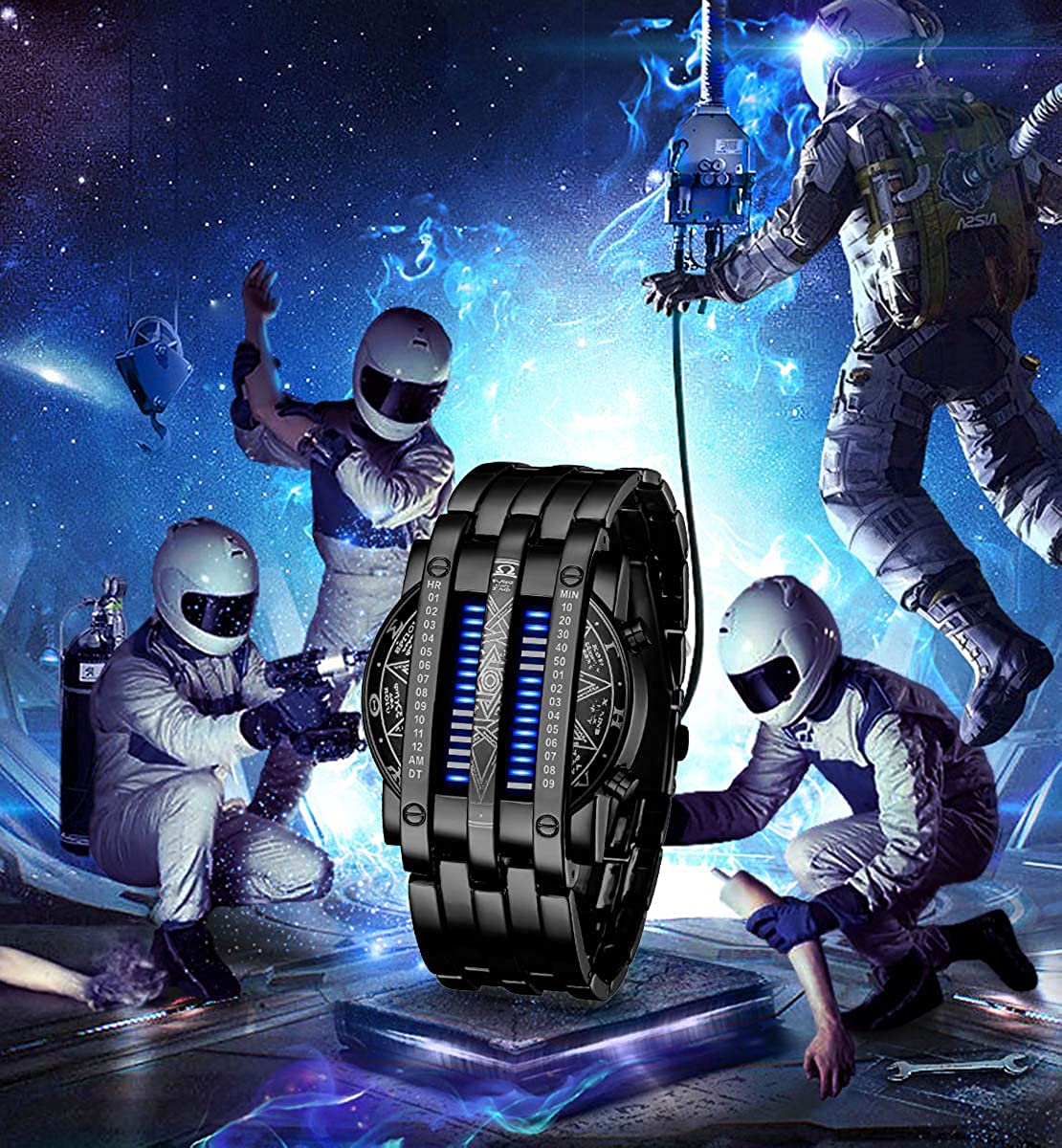 Binary Matrix Blue LED Digital Watch Mens Classic Creative Fashion Black Plated Wrist Watches