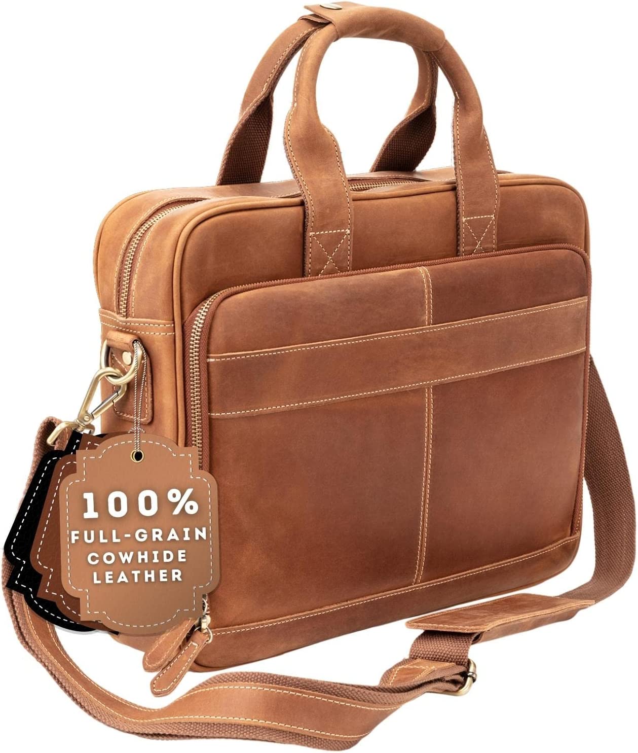 Luxorro Full Grain Leather Briefcases For Men, Handcrafted Leather Laptop Bag For Men, Our Leather Bags For Men Come In A Beautiful Gift Box, Perfect Christmas Gifts For Men, Brown, Fits 15.6" Lap
