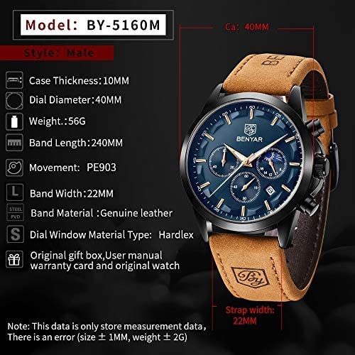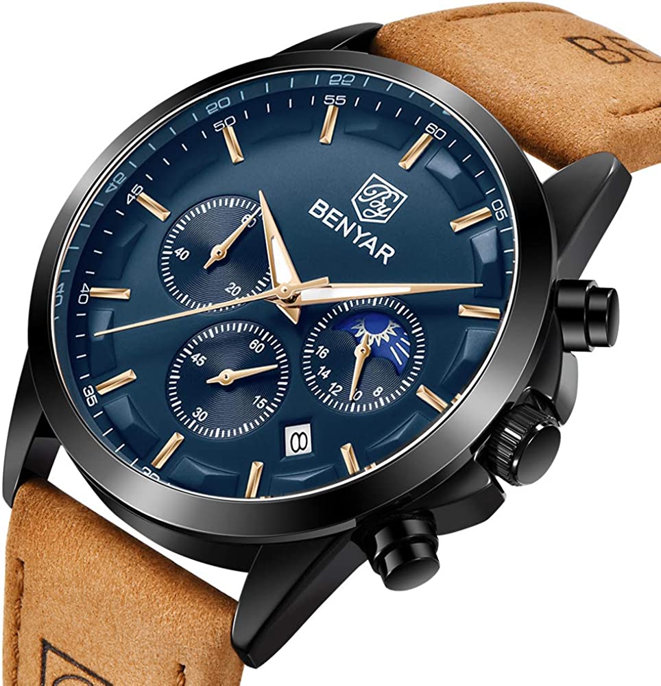 • ?【100% MONEY BACK GUARANTEE】Use our chronograph sports quartz watch with 100% risk free.BENYAR Watch 90 Day Money Back Guarantee for any Reason; 2 Years Warranty for Quality related issues. Customer satisfaction is our first priority we don't compromise on the quality of material. Buy our waterproof wrist watch care-free.