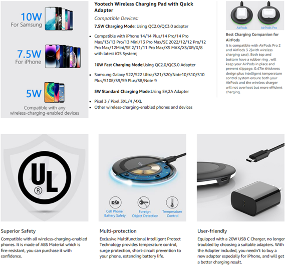 - ▶[PACKAGE AND SERVICE]: You will get 1 x Wireless Charging Pad, 1 x 3. 3ft USB C-C Cable, 1 x 20W USB C Charger, User Manual and reliable 12-hour response service. At Yootech, zero risk purchase is for every customer's smiles.