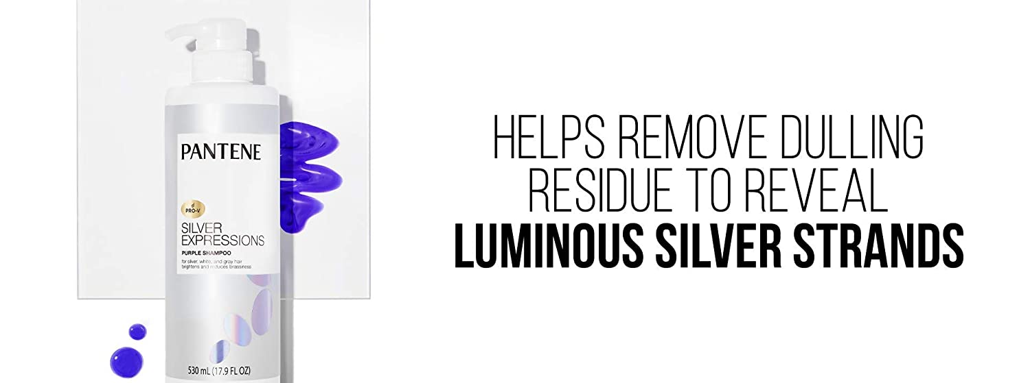 Want more silver and less gold? The Pantene Pro-V Silver Expressions Purple Shampoo you love is back with a brand new look. This purple-pigmented cream reduces dullness*, giving you a brighter, more toned look. Purple can color-correct or neutralize excess yellow, bringing back your original tone. After youve finished blaming sunshine, pool time, and even your tap water for adding brassiness, pick up your purple shampoo. It works wonders for gray, white, and silver hair. Lather up daily, or as you see fit, always making sure to leave it in for 3-5 minutes for the best results. Meanwhile, enjoy the luxurious scent of lotus flowers. Now you're on your way to another #greathairday.