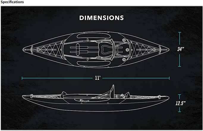 • Kayak Specifications - Exterior: 11’(L) x 34”(W) / Weight: 23 Lbs. / Capacity: 300 Lbs. 1 Adult, Gear, or a Furry Friend / Inflation Time: 9 Mins. / Inflation Pressure: 2 PSI Side Tubes & 1 PSI Floor