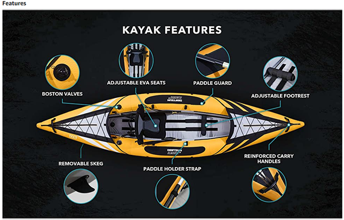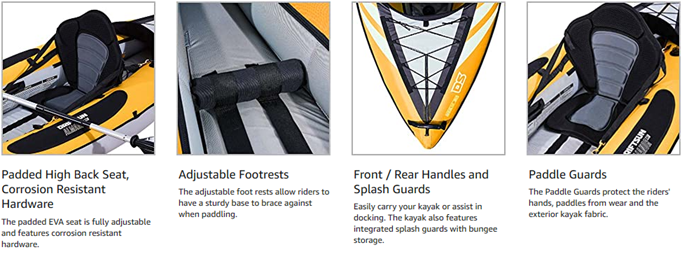 • Package Includes - (1) Adjustable EVA Padded Seat with High Back Support, (1) Dual Blade Kayak Paddle, (1) Deluxe Dual Action Pump, (1) Quick-release fin, (1) Foot Rest, and (1) Travel Bag