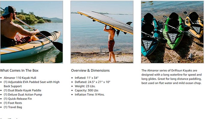 • Paddle ParksOutdoor-Adventure AwaitsThe Driftsun Almanor 146 Inflatable Kayak is the complete outdoor-adventure ready package you need to own the water. It’s lightweight design will put you on the water fast. It’s workmanship impeccable. It’s quality inspections ruthless. The lakes are waiting. Go with a Driftsun.Package Includes