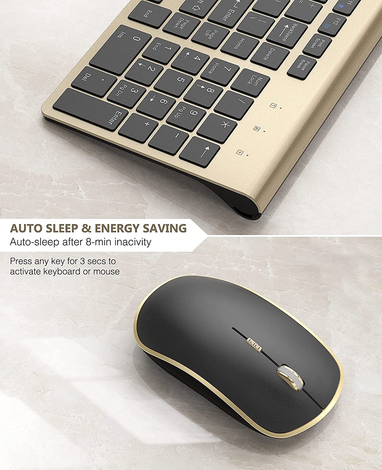 • 【Stable 2.4G Wireless Connection& Long Standby】2.4GHz wireless signal delivers up to 10 meters connection. The optical mouse working currency is only 0.11mA and will automaticly enter power saving mode if inactivity in 20s; easily wake it up by moving.The compact keyboard also come into sleep in 8 minutes if no typing. *Battery not included in package.