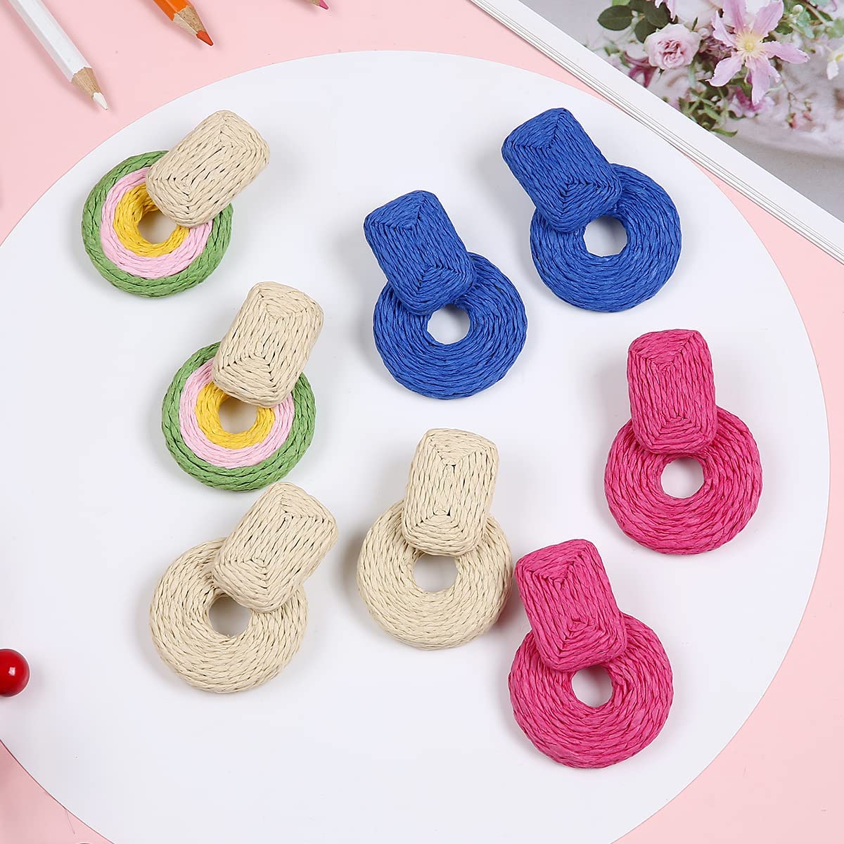 Boho Beach Earrings multipack: this Raffia Handmade Woven Earrings features: 2pcs front and back woven geometric shapes combination,Stylish and simple design style,Beautiful lightweight earrings-Perfect clothing accessories jewelry for summer.