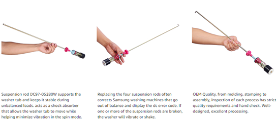 • 【Overview】Suspension rod DC97-05280W supports the washer tub and keeps it stable during unbalanced loads. acts as a shock absorber that allows the washer tub to move while helping minimize vibration in the spin mode. Replacing the four suspension rods often corrects Samsung washing machines that go out of balance and display the dc error code. If one or more of the suspension rods are broken, the washer will vibrate or shake.