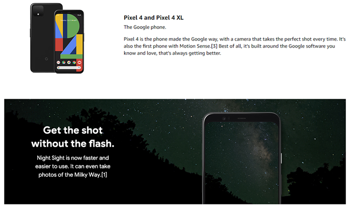 Pixel 4 is the phone Made the Google way. So it’s built around the helpful Google software you know and love, that’s always getting better. 1) See G.Co/Pixel/astrophotography to Learn more about astrophotography on Pixel 4. 2) Us only. English only. 3) Coming soon to Japan. Motion sense functional in the us, Canada, Singapore, Australia, Taiwan, and most European countries. Not all phone features are controlled by motion sense. 4) Us & Canada only. English only. 5) Approximate battery life based on a mix of talk, data, standby, mobile Hotspot and use of other features, with motion sense off and always on display off. Use of motion sense, an Active display or data usage will decrease battery life. Pixel 4 and 4 XL testing conducted in Mountain View, California in August 2019 on pre-production hardware and software. Actual results may vary. 6) Up to 10 W with Pixel 4 and Pixel 4 XL charging with Pixel Stand (Sold Separately). actual results may vary.