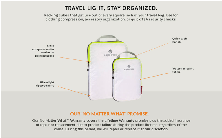 - NO MATTER WHAT WARRANTY - Eagle Creek's Lifetime Warranty, plus the added insurance of repair or replacement due to product failure during the product lifetime, regardless of the cause
