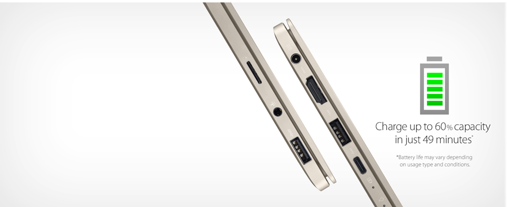 - A specially designed 50Wh lithium-polymer battery gives UX331 up to 14 hours of autonomy, with fast-charge technology that takes just 49 minutes to recharge to 60% capacity