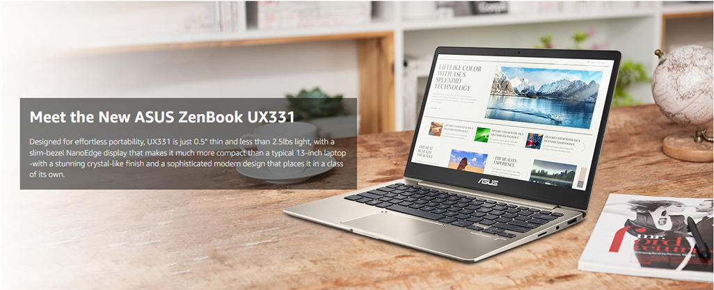 Designed for effortless portability, UX331 is just 0.5” thin and less than 2.5lbs light, with a slim-bezel NanoEdge display that makes it much more compact than a typical 13-inch laptop -with a stunning crystal-like finish and a sophisticated modern design that places it in a class of its own.