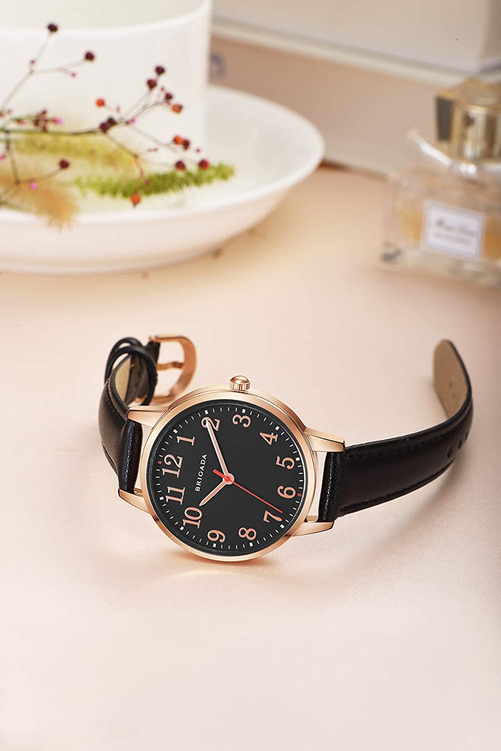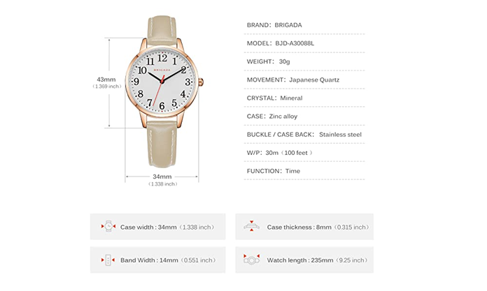 • ❤Round white dial with legible Arabic numeral scale make the timepiece keeping good time. Red second hand is elegant and eye-catching, rose gold case comes with soft and wear-resistant beige watch band, love at first sight.