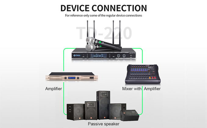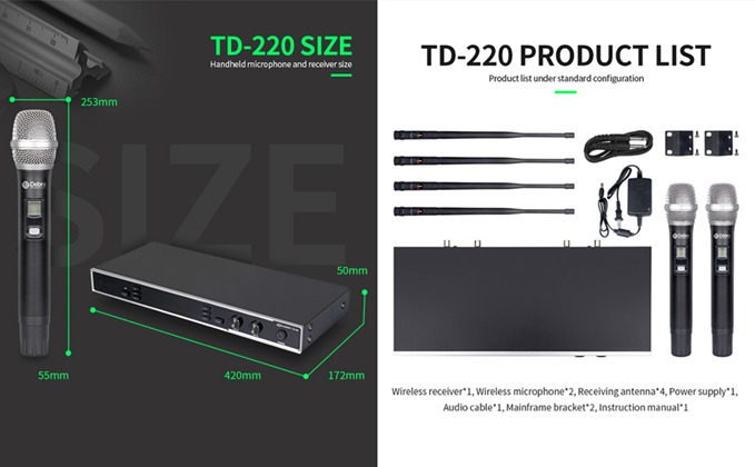 D Debra Audio TD-220 is true diversity dual microphone four receive and antenna, effectively overcome the frequency of dead ends, UHF band, PLL digital frequency synthesis. The Optimal distance arrived 650 Foot operation range.